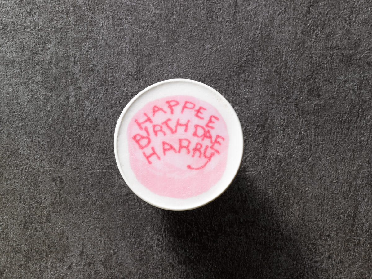 バースデーケーキと同じロゴが施された、ファン必見の一杯です。