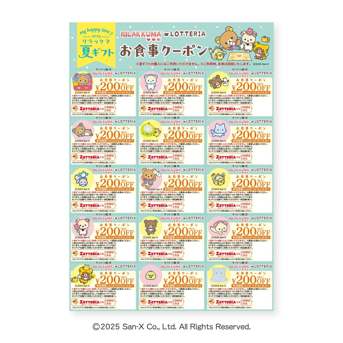 「リラックマ」グッズに付いてくる3,000円分のお食事クーポンは、200円引きが15枚。