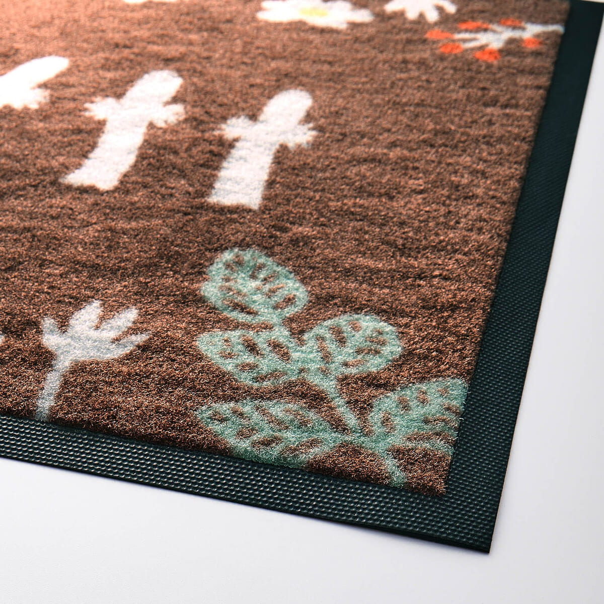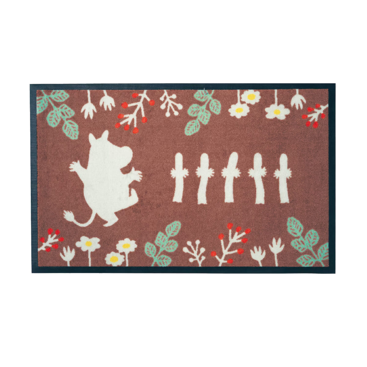 「ムーミン」と「ニョロニョロ」が森の中で遊んでいるような柄が楽しい玄関マット。