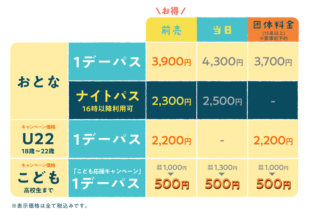 販売価格:おとな3,900円、U22パス2,200円、こども(4才~高校生)500円