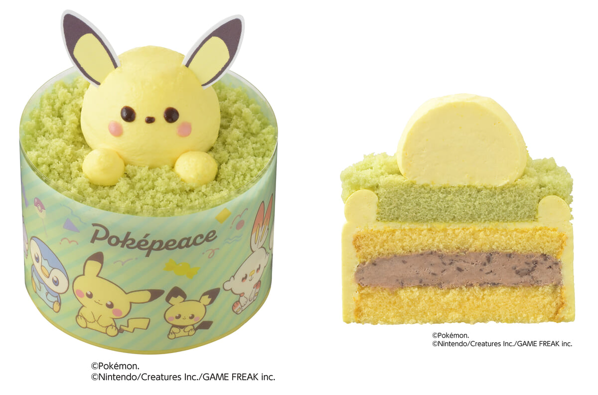 「<ポケピース>ピカチュウのチョコバナナケーキ」は、バナナクリームで仕上げたピカチュウのまわりに抹茶スポンジクラムを散らした、やさしい味わいのケーキです。