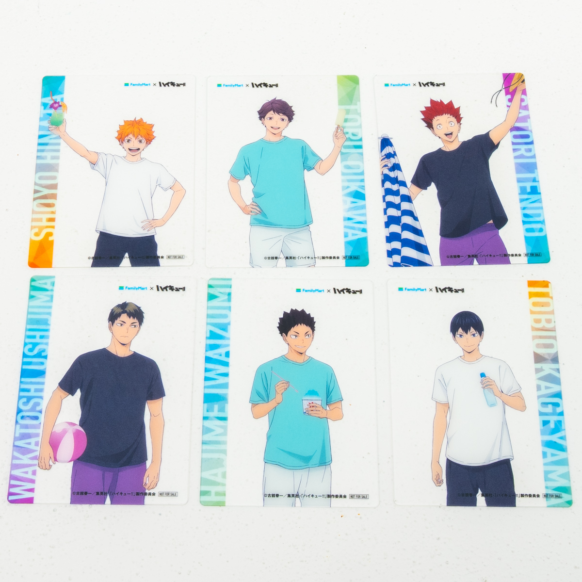 烏野高校日向翔陽、烏野高校影山飛雄、青葉城西高校及川徹、青葉城西高校岩泉一、白鳥沢学園高校牛島若利、白鳥沢学園高校天童覚の6種類。
