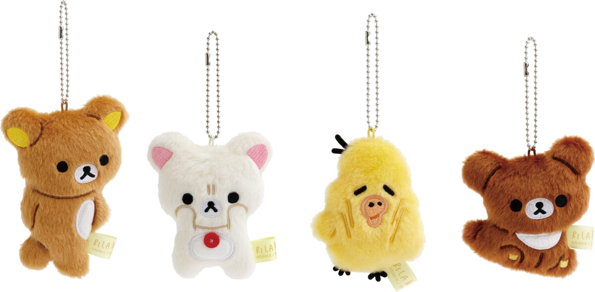 「リラックマ」「コリラックマ」「キイロイトリ」「チャイロイコグマ」の、ユニークなデザインのぶらさげぬいぐるみ。