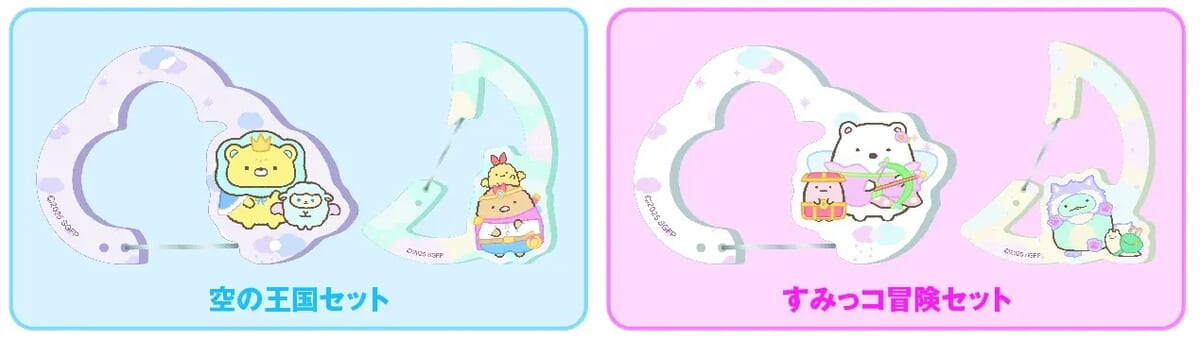 かわいい「すみっコ」デザインのカラビナキーホルダーが付いた特典付きムビチケ「空の王国セット」「すみっコ冒険セット」の2種類が登場します!