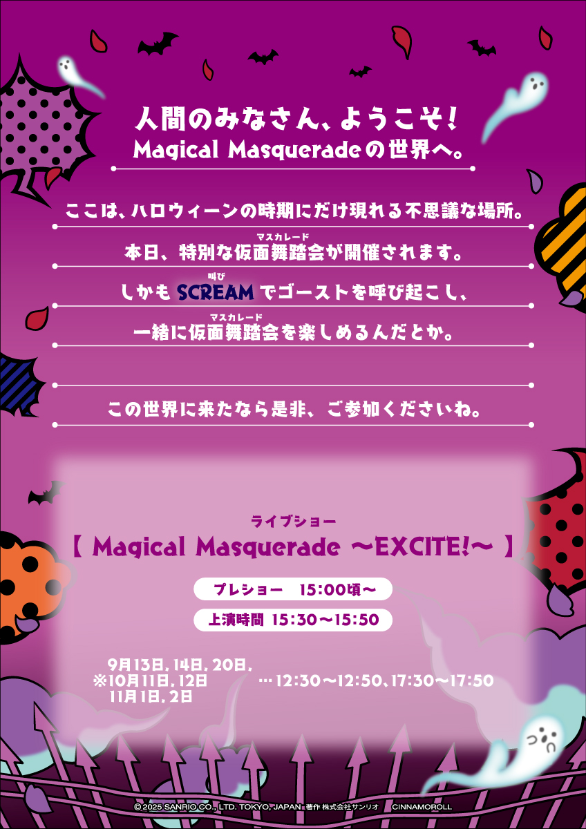 ゴーストたちの集う妖しい仮面舞踏会(マスカレード)をテーマに、かわいいだけじゃない、恐怖・興奮・驚きの3つのSCREAM!!が思わず飛び出してしまうようなスペシャルなコンテンツが楽しめます。