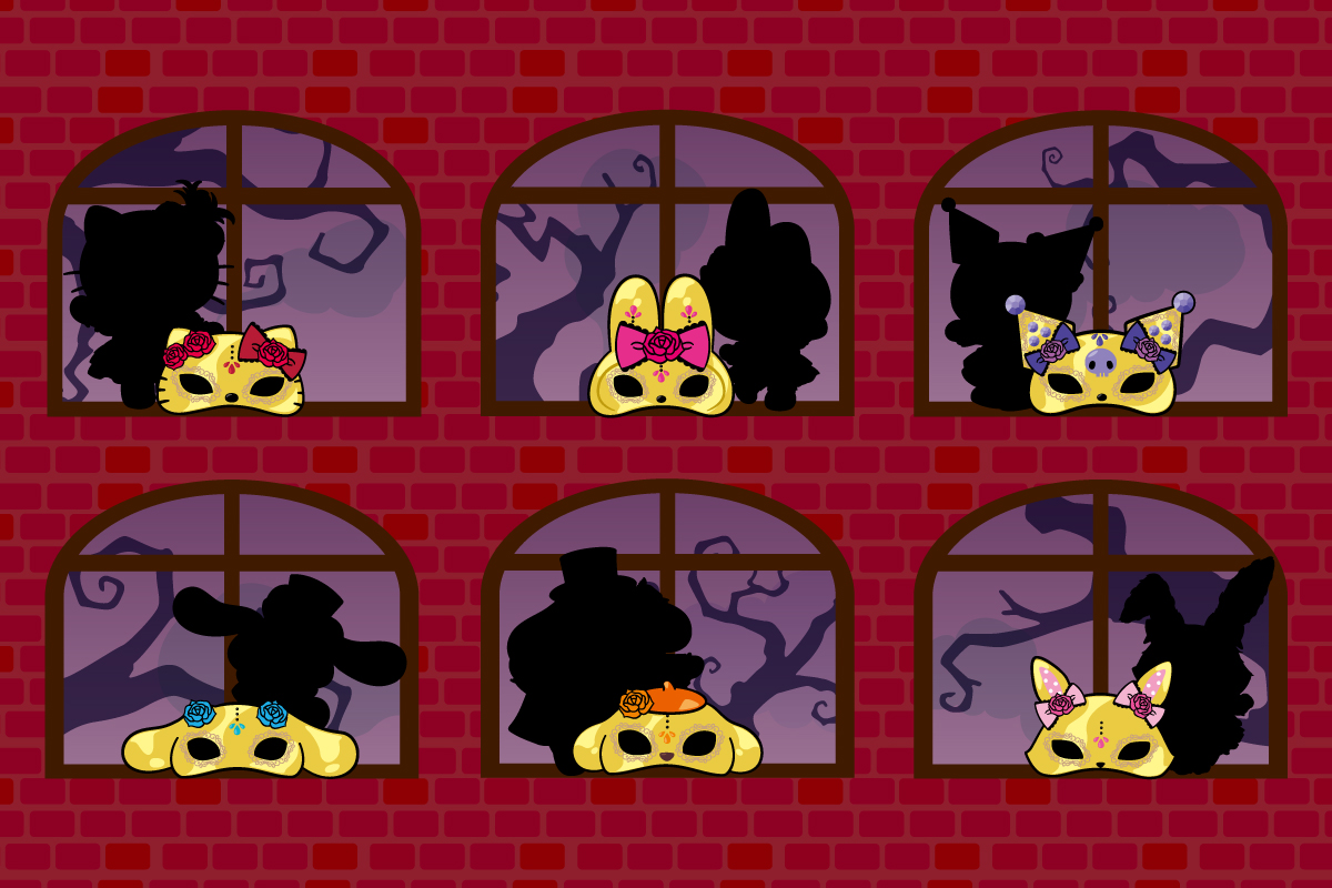ゴーストたちも訪れる秘密の仮面舞踏会のステージに、仮面を身につけた華やかなコスチュームのハローキティたちが登場します。