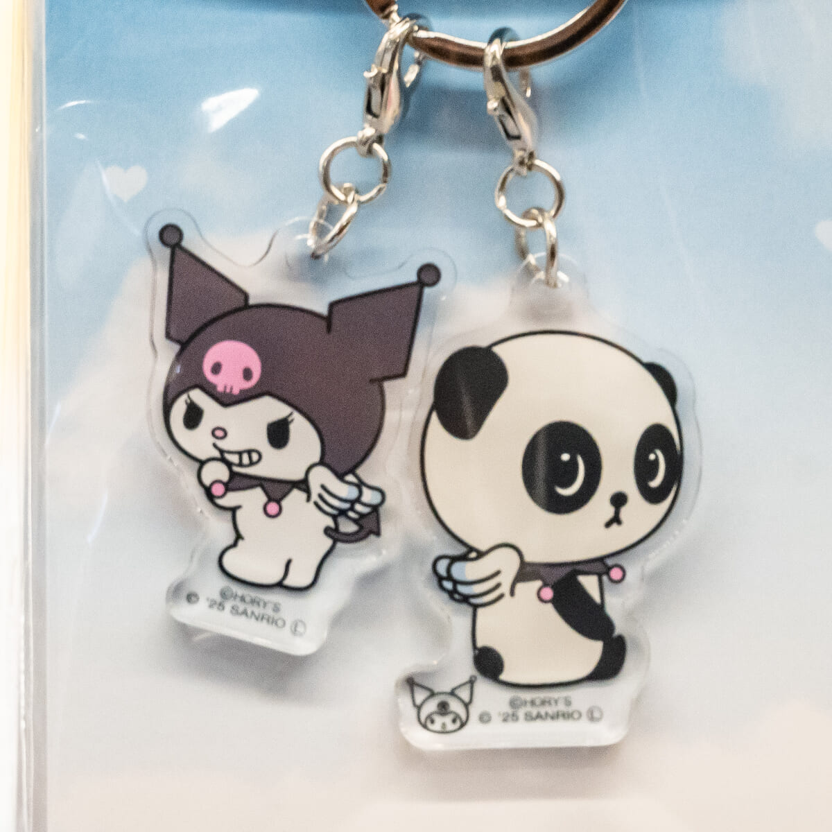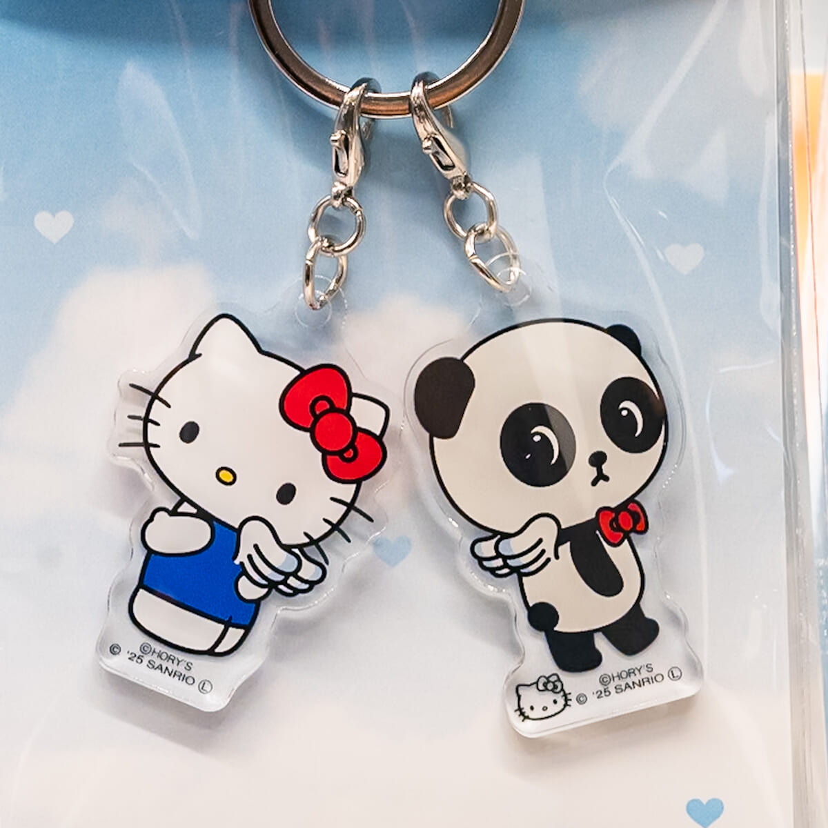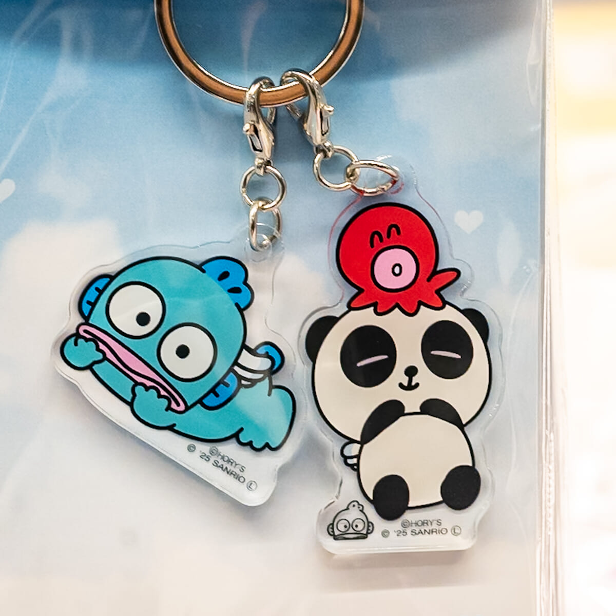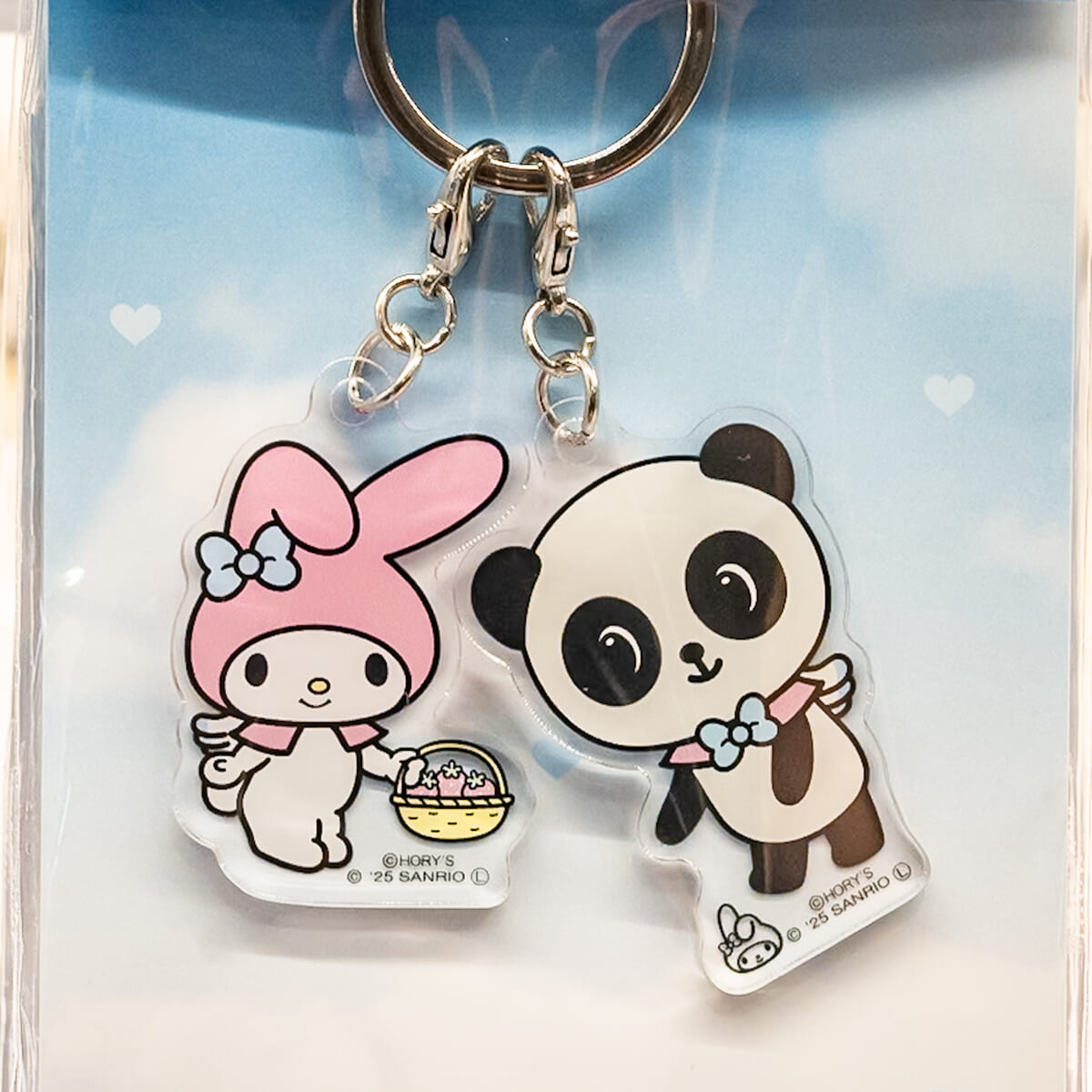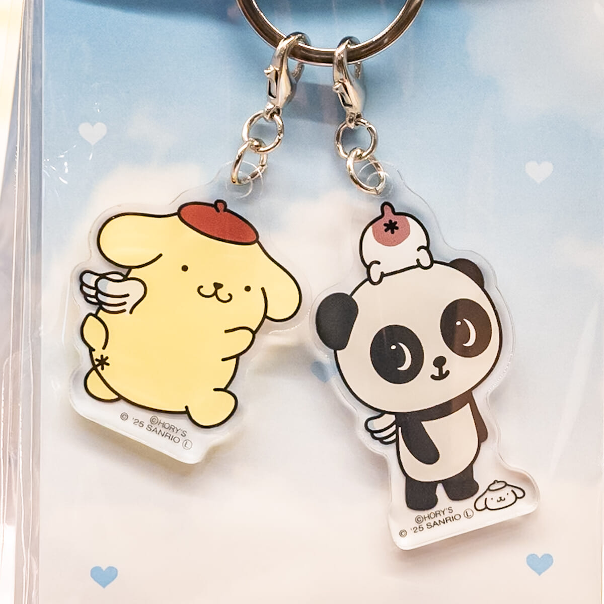 サンリオキャラクターとパンシェルの仲良しデザインが楽しめる2連アクリルキーホルダー。