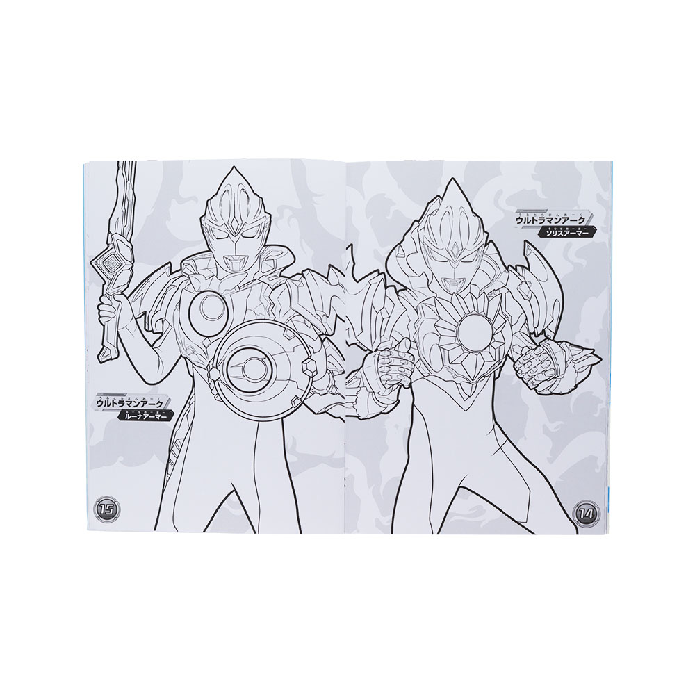 右手を広げる「ウルトラマンオメガ」の背景に歴代ウルトラヒーローたちをデザインした、B5サイズのぬりえ。
