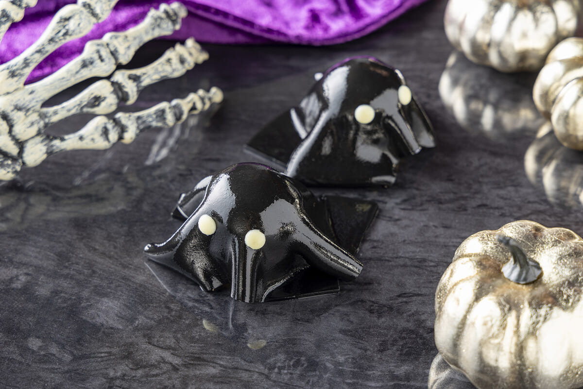 つるんと光る黒いヴェールをまとった「おばけバナナケーキ」は、真っ黒な竹炭入りのジュレが特徴。