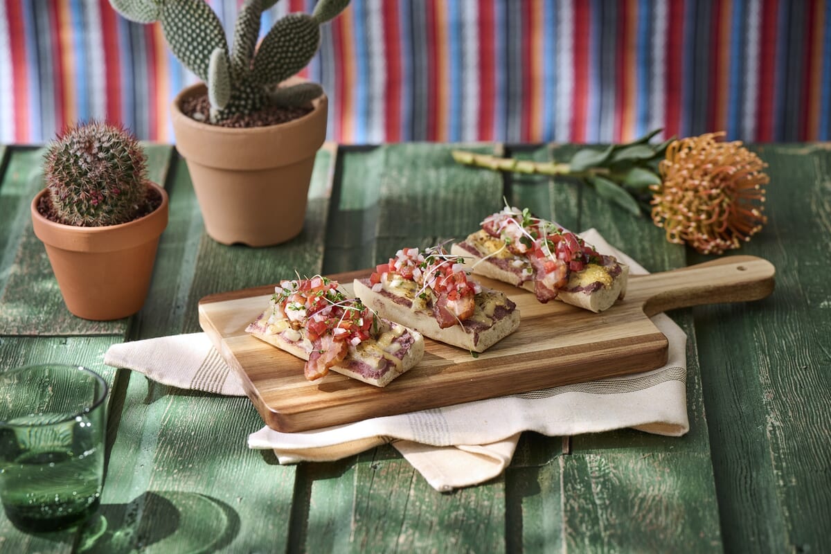 トマトや玉ねぎのサルサ“ピコ・デ・ガジョ”とベーコン、チーズをのせて焼き上げた「モジェテス」