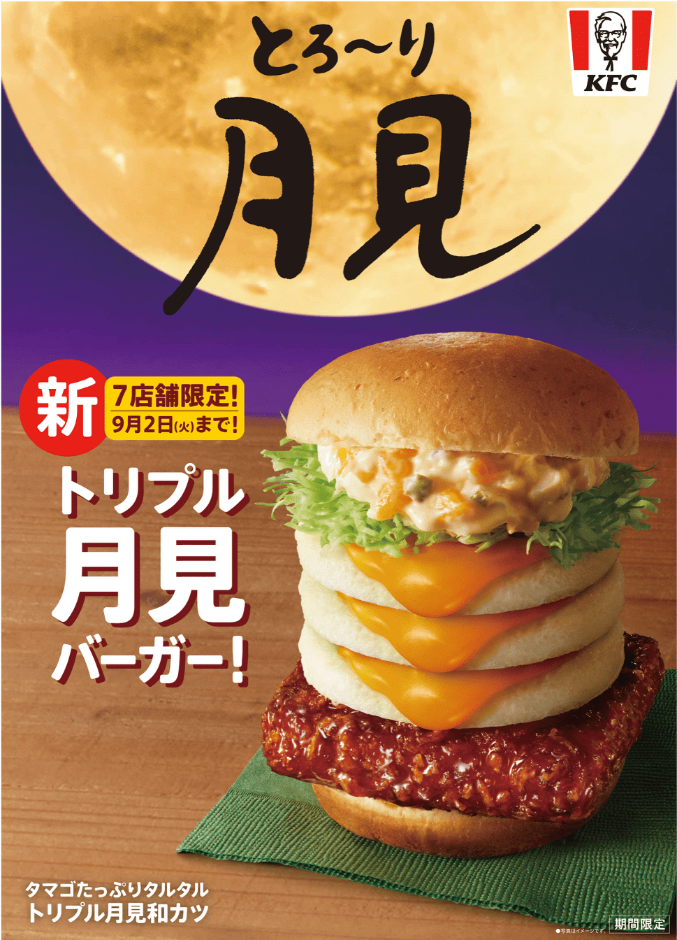 2025年8月20日より全国7店舗にて、ふんわり目玉焼き風オムレツを3つ積み上げた「トリプル月見バーガー」が登場します!