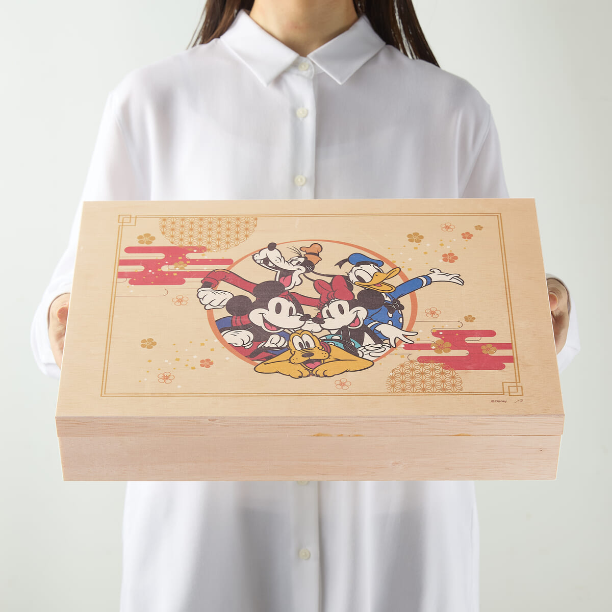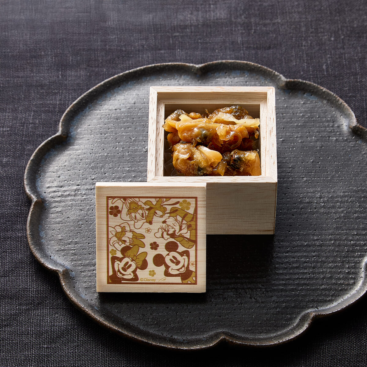 木箱に満面の笑みを浮かべる「ミッキー&フレンズ」を描いた若炊きあさりや味付数の子、プレーンといちご味のフロマージュ、栗きんとん、焼き印が施された紅白かまぼこも入っています。