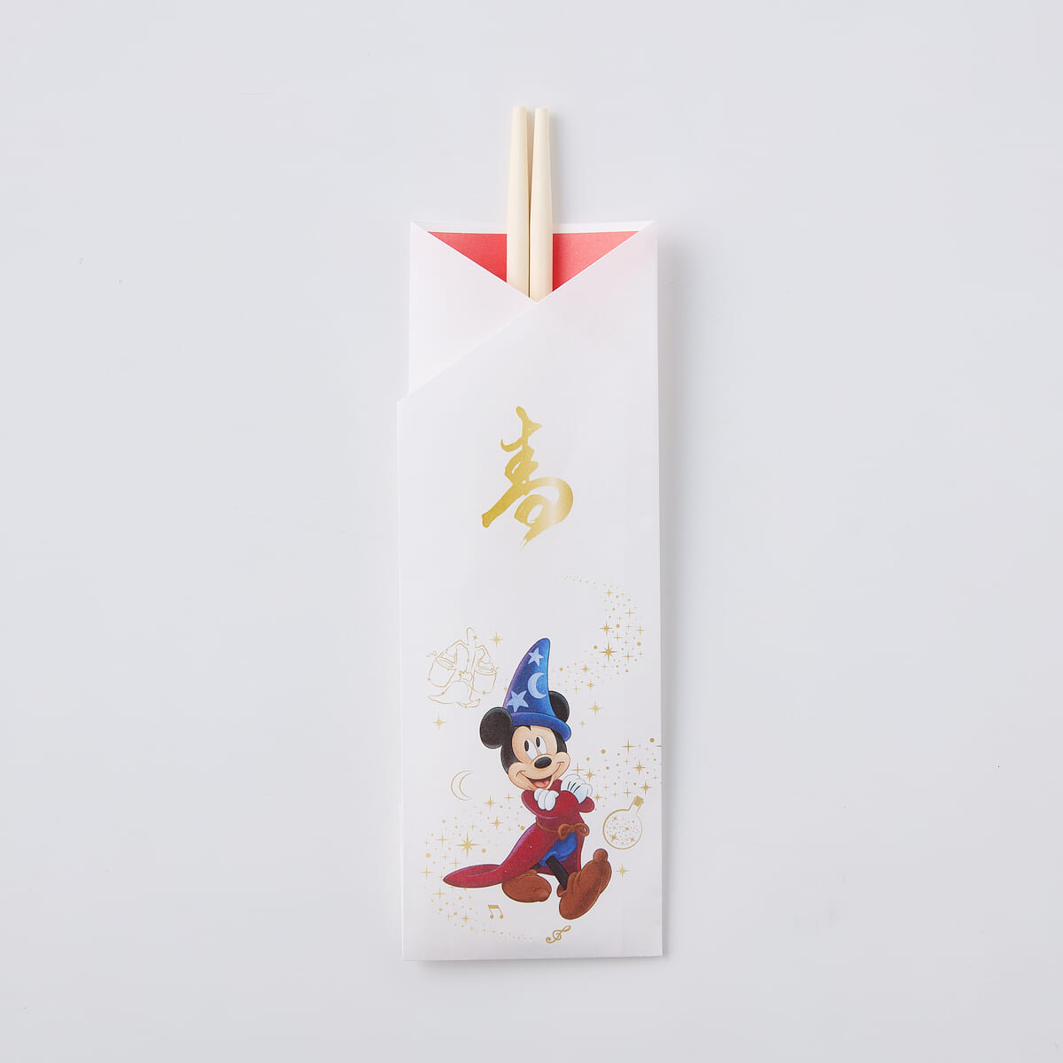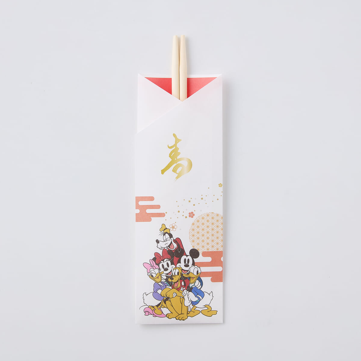 「ミッキー&フレンズ」の集合アートを箸袋にプリントした祝い箸も一緒に届きます。