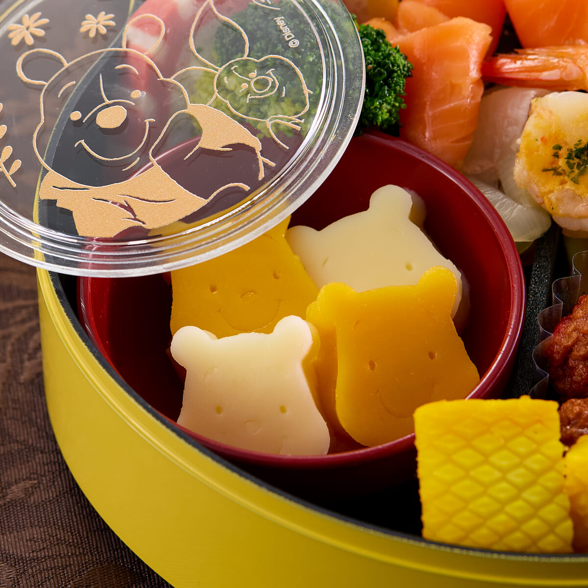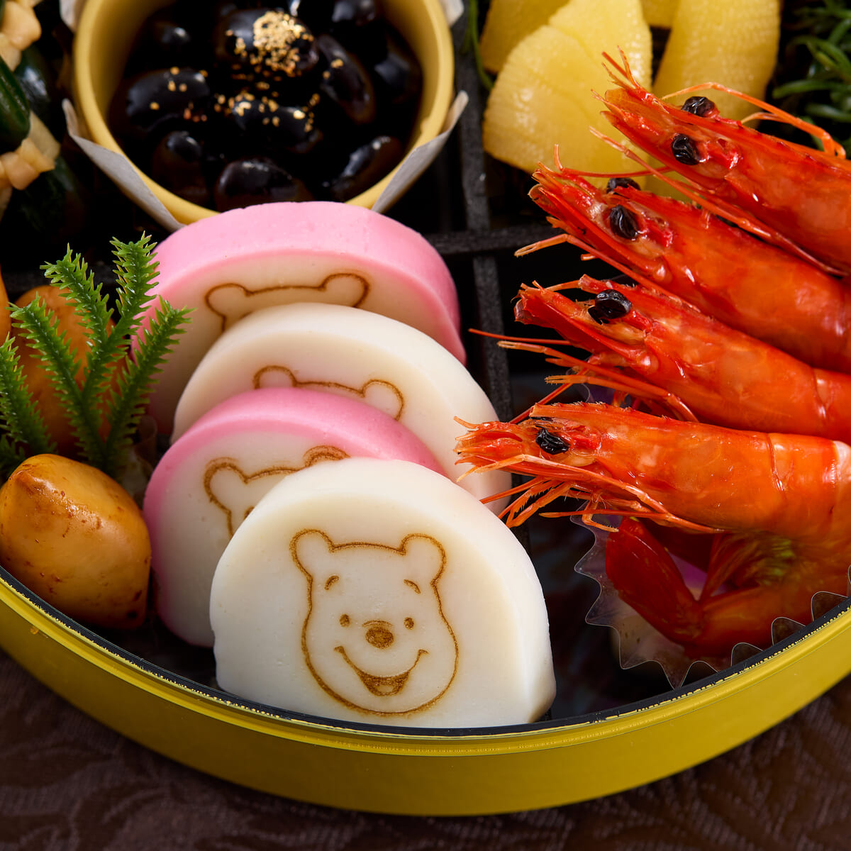 「くまのプーさん」と「ピグレット」が抱き合っている仲睦まじい様子のアートをデザインした重箱を使用した、大人向けの豪華なおせち。