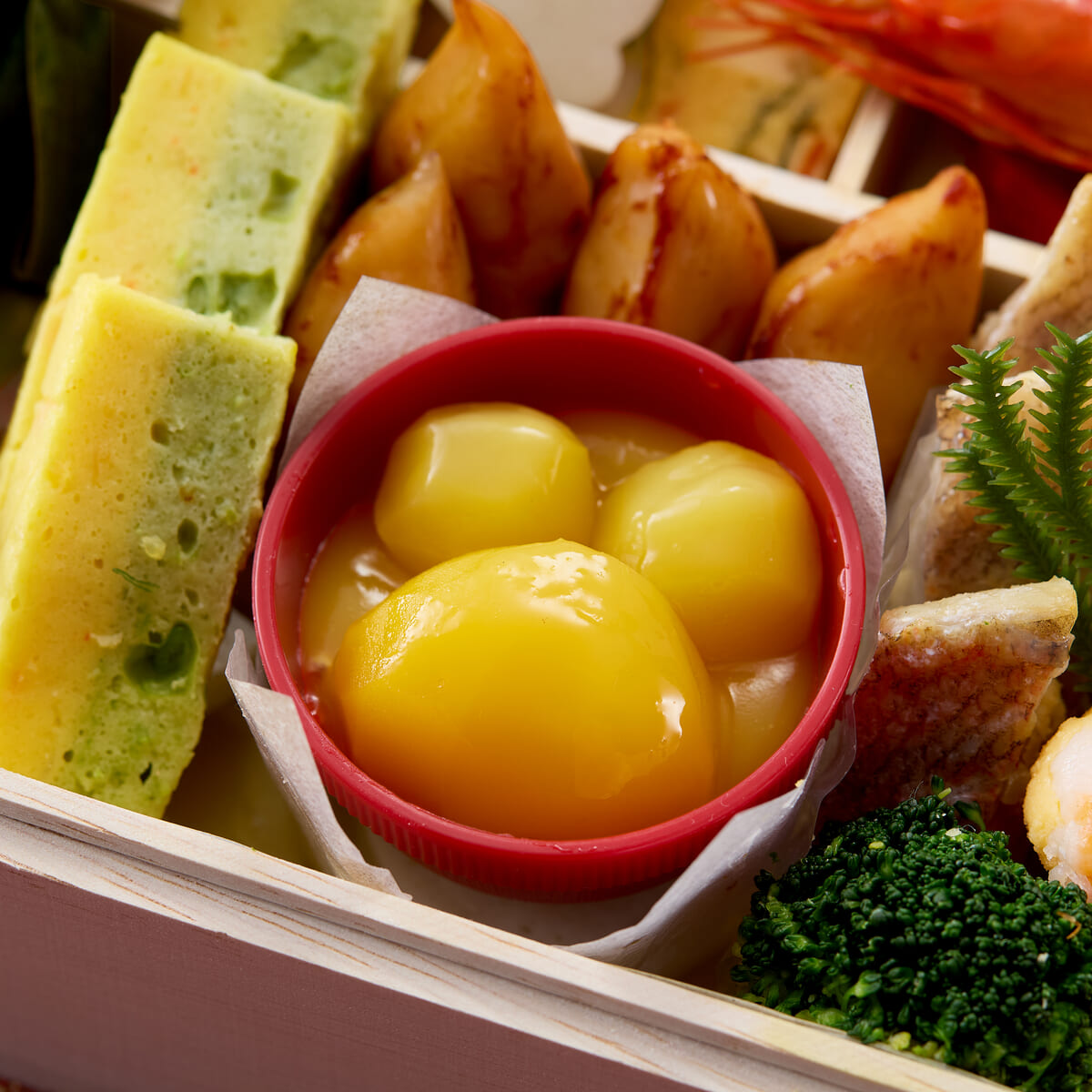 紅白かまぼこのほか、つぶ貝雲丹焼などの45品目48種の高級感ある食材が盛り込まれています。