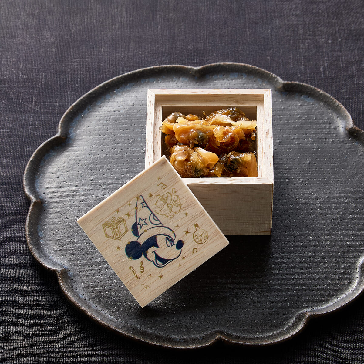 『ファンタジア』のアートを描いたミッキーのフェイス型重箱の中に、扇子型の昆布をのせた味付数の子や