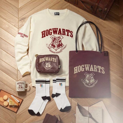リバーシブルのトートバッグ、ホグワーツエンブレム付きのポーチや胸元に大きなサガラ刺繍を施したスウェットと男女で楽しめる2サイズ展開のラインソックスなどのアパレル用品が展開されます。
