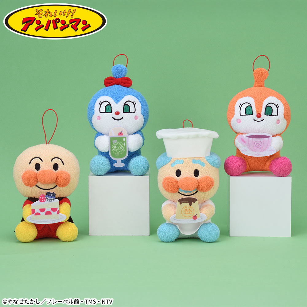 「アンパンマン」となかまたちが、スイーツやドリンクなどを持ったぬいぐるみ。