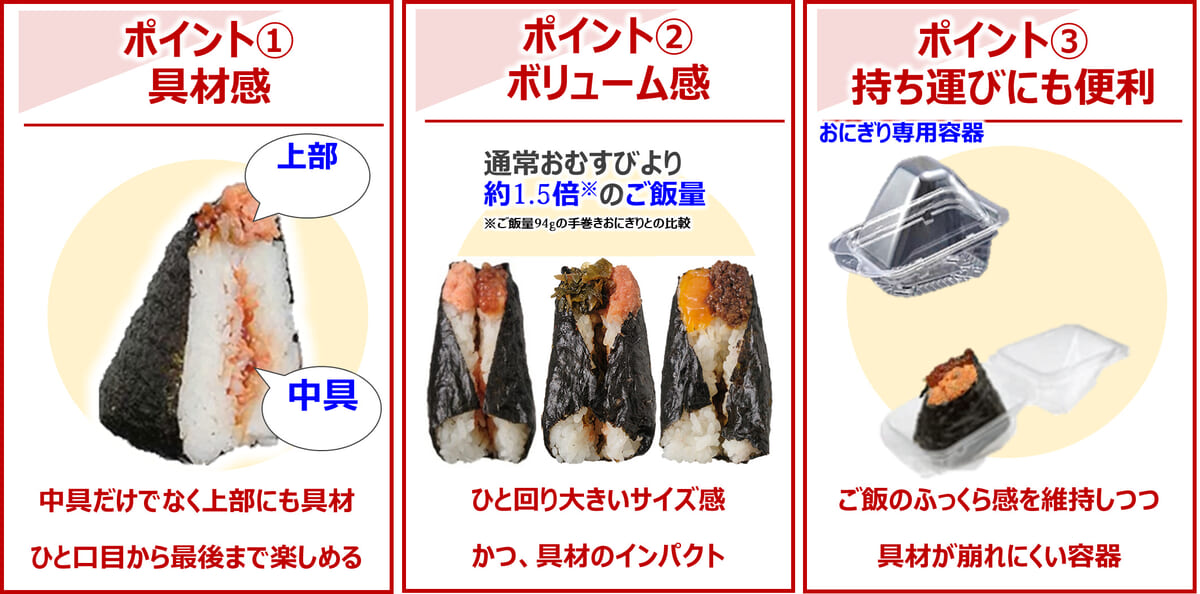 おむすびの上部と中具の2ヵ所に具材をたっぷりと盛り付けることで、どこから食べても具材の美味しさが口いっぱいに広がります。
