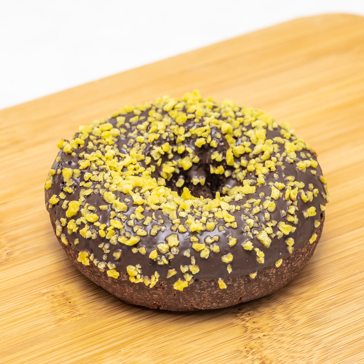 チョコを練り込んだケーキドーナツに、コーティングチョコとバター風味のクランチがトッピングされています。