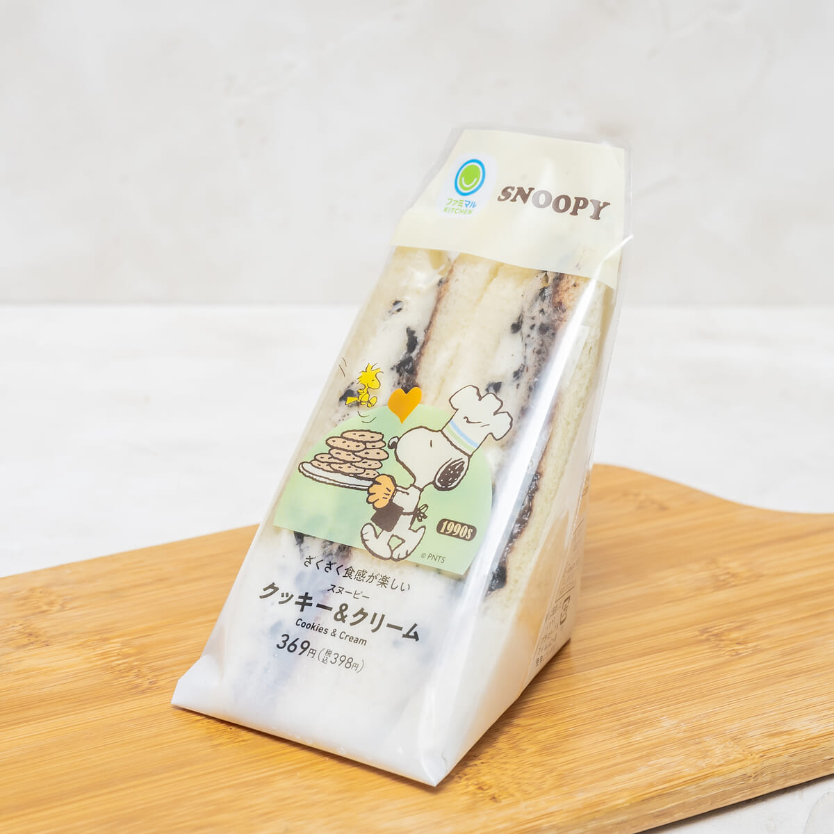 白黒のビーグル犬である「スヌーピー」のカラーをイメージした、ざくざく食感が楽しいクッキー&クリームのサンドイッチ。