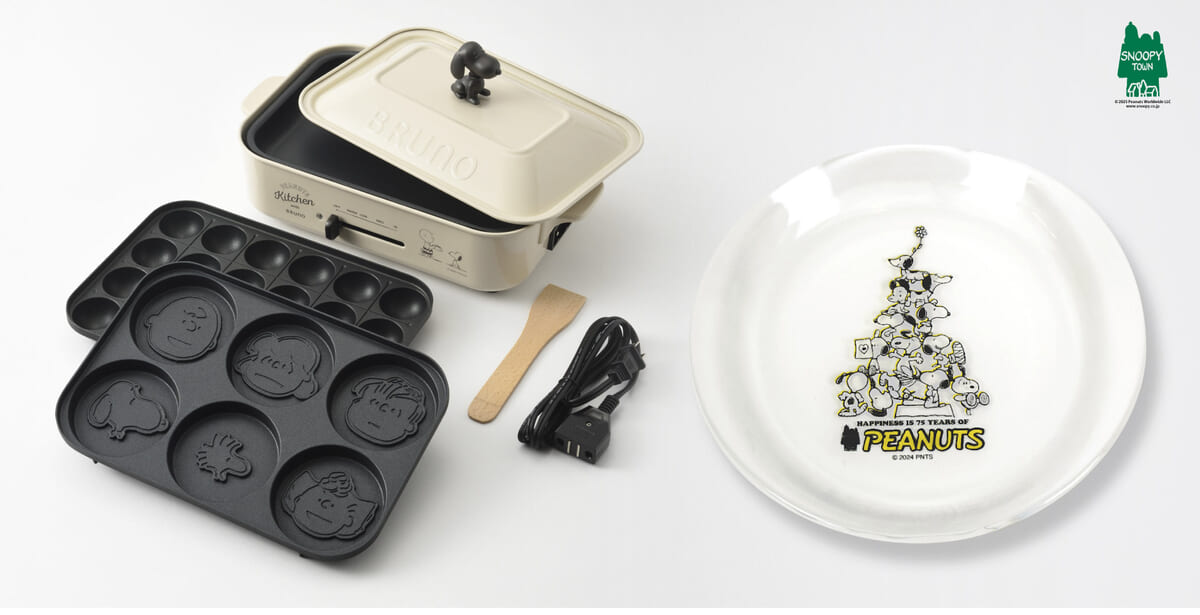 「スヌーピー」と仲間たちの形をしたパンケーキが焼ける大人気BRUNOのホットプレートに『PEANUTS』コミック誕生75周年のオリジナルプレートがセットになった特別セットです。