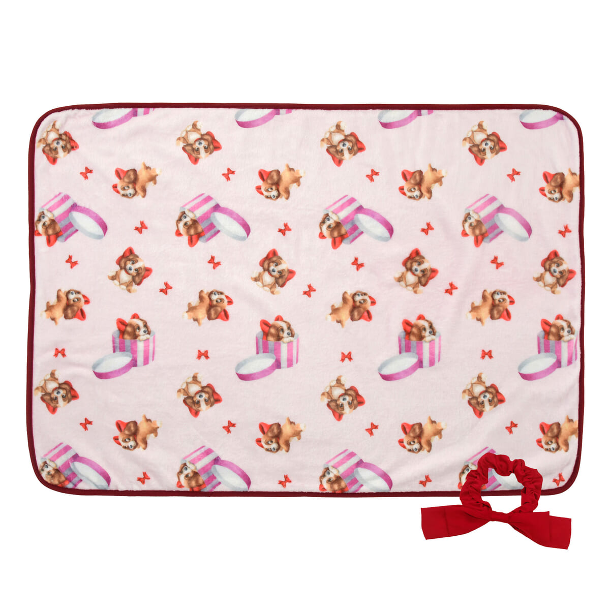 やわらかな起毛素材でできたシュシュ付きブランケット。
