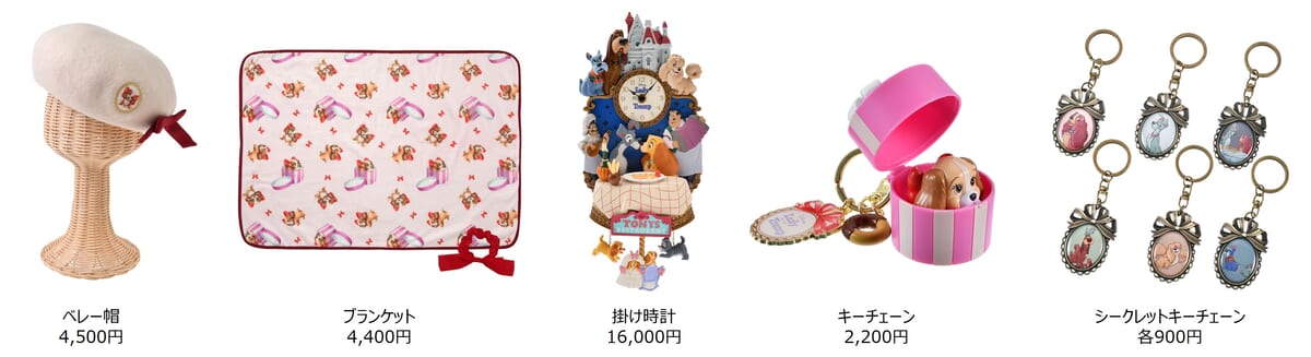 「レディ」「トランプ」「見つめ合う「レディ&トランプ」、「トラスティ」と子犬の「アネット&コレット&ダニエル&スキャンプ」「ペグ」「ジョック&スキャンプ」の絵柄が用意されています。