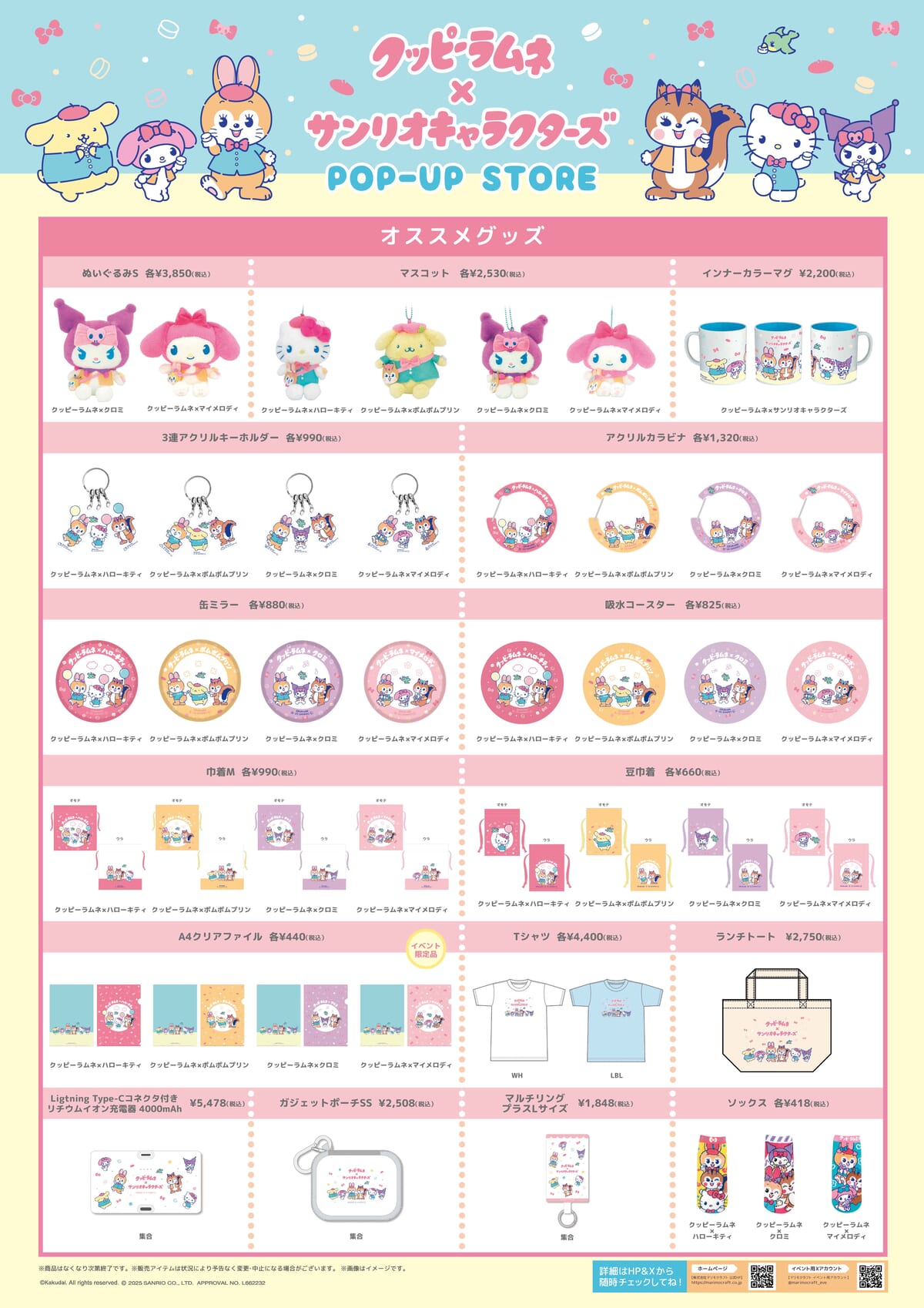 「ハローキティ」や「ポムポムプリン」「マイメロディ」「クロミ」と「クッピーラムネ」がコラボしたかわいいグッズが盛りだくさん。