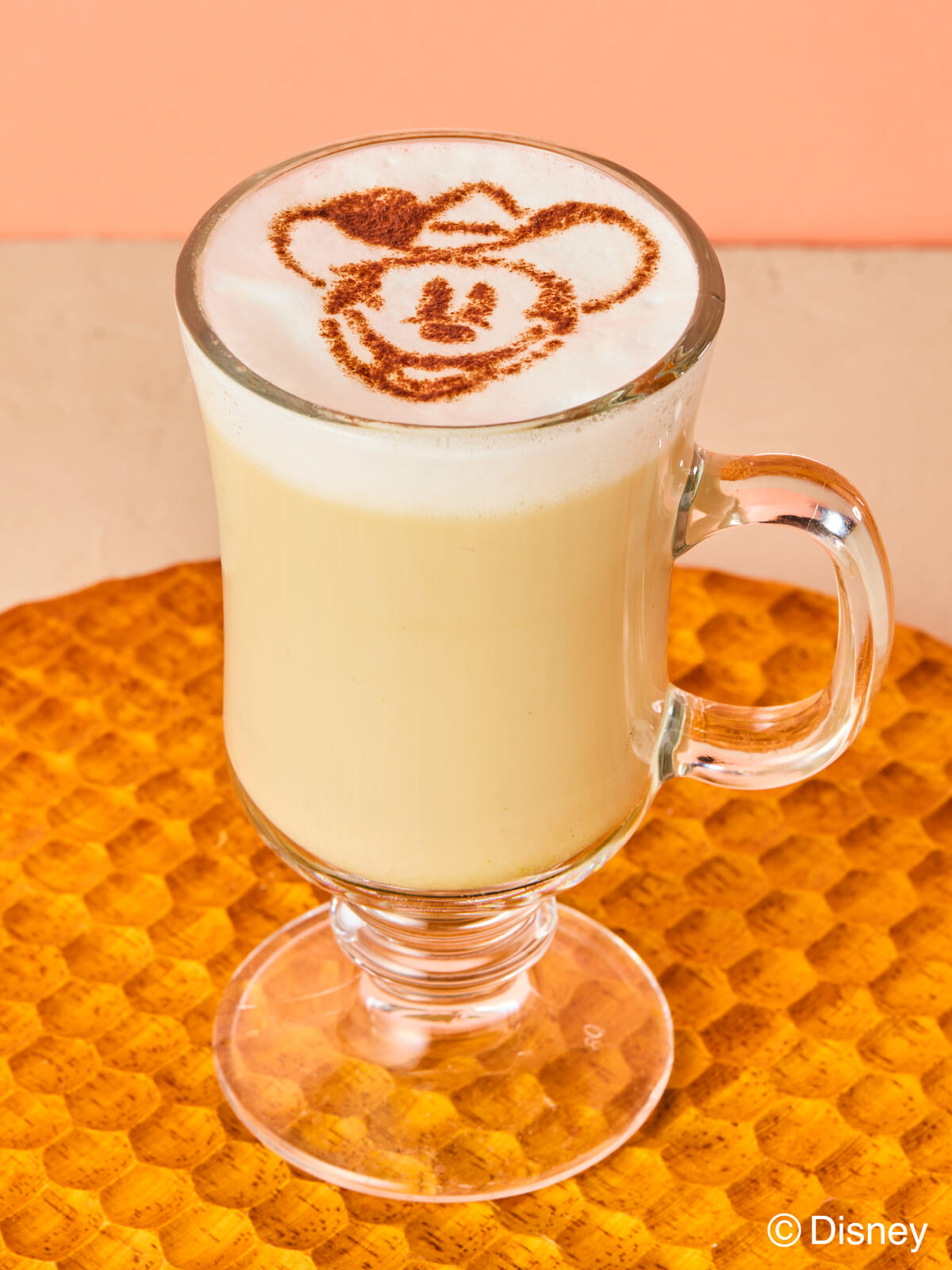 甘酸っぱいオレンジピューレ、ふわふわのミルクフォームを加え、「グーフィー」のフェイスアートをココアでトッピングしています。