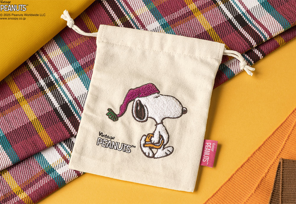 サガラ刺しゅうの「スヌーピー」がかわいいオリジナル巾着。