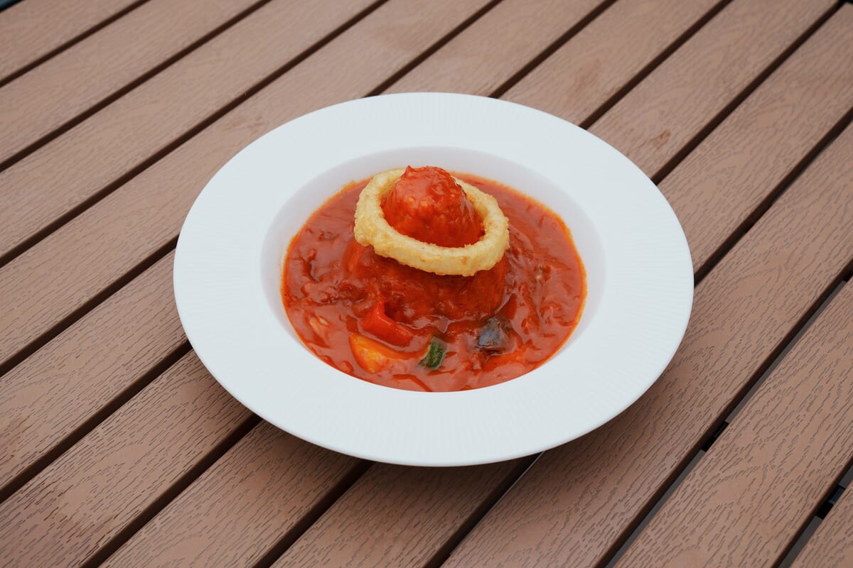パプリカ、なす、ズッキーニの秋野菜とベーコンが入ったトマトソースはちょっぴりスパイシーな大人の味です。