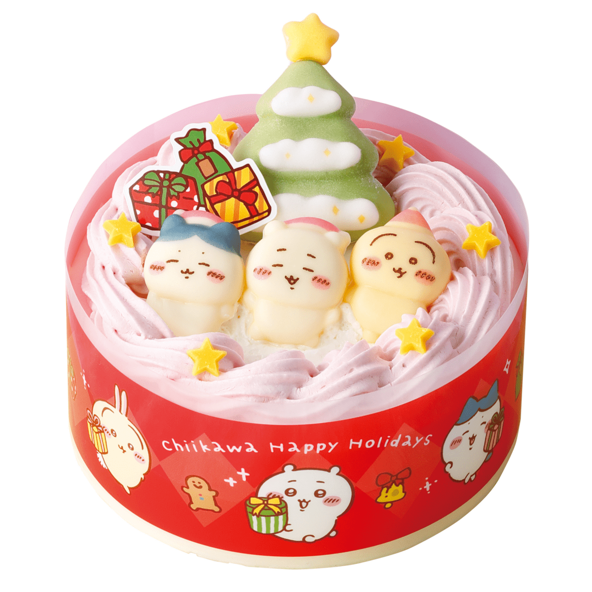 「ちいかわ」デザインのクリスマスケーキは、2024年コンセプトは”雪あそび”でしたが、2025年は雪あそびで疲れて、ツリーの前でプレゼントを待ちわびながら寝てしまった様子を再現。