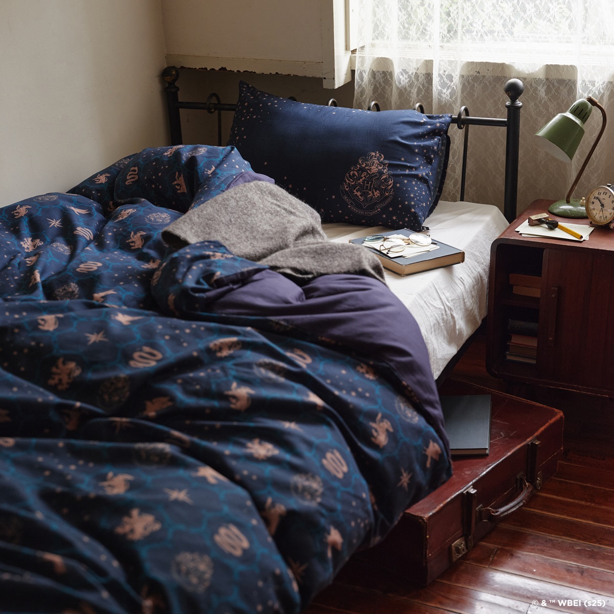 ベッドまわりのグッズは、深みのあるネイビーにゴールドの寮章で高級感あるデザインに。