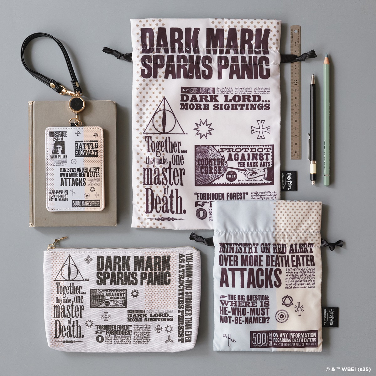 日刊予言者新聞をモチーフにしたポーチや巾着、深みのあるネイビーにゴールドの寮章が高級感をかもし出すグッズも揃います☆