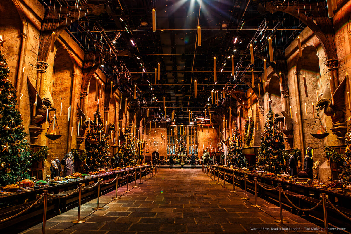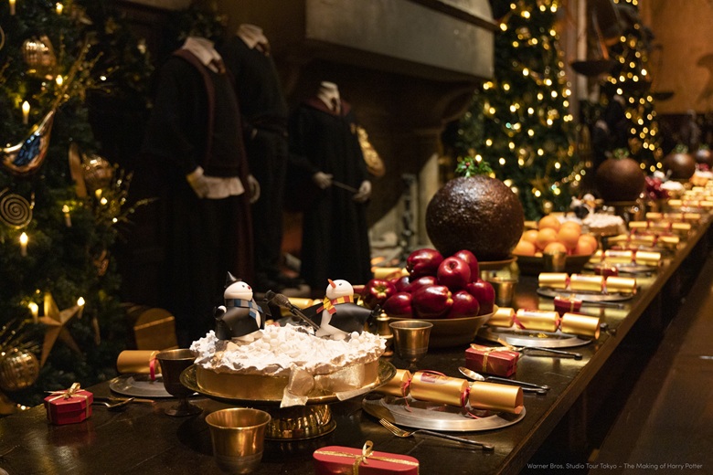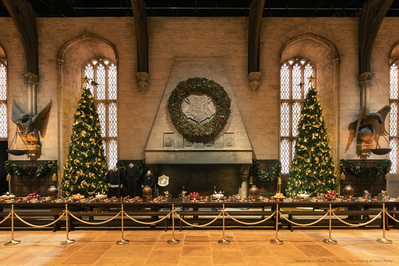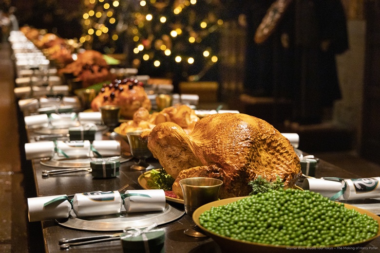 スタジオツアー東京で人気のセットである大広間には、高さ5mを超えるツリーが並び、ガーランドやテーブルいっぱいに並ぶクリスマスのご馳走の装飾が、温もり溢れる雰囲気を演出します。