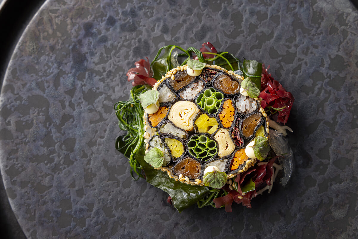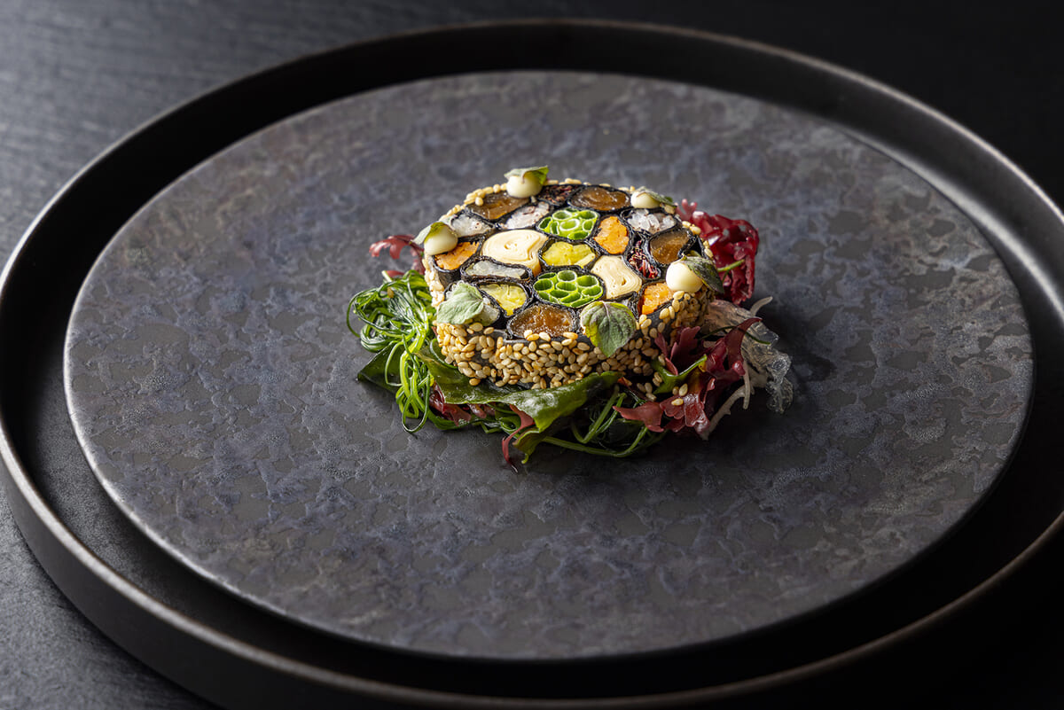 日本の乾物文化や漬物文化、発酵文化などを未来に向けて再解釈した新しい感性の一皿は、グルテンフリーでヴィーガンな至極の一品です。