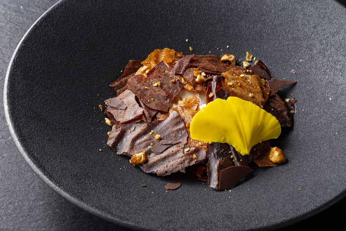 デザートの「栗のエスプーマ」は、シナモンアイスを栗のエスプーマで包み、チョコレートチュイルで枯葉と銀杏の葉っぱを表現。
