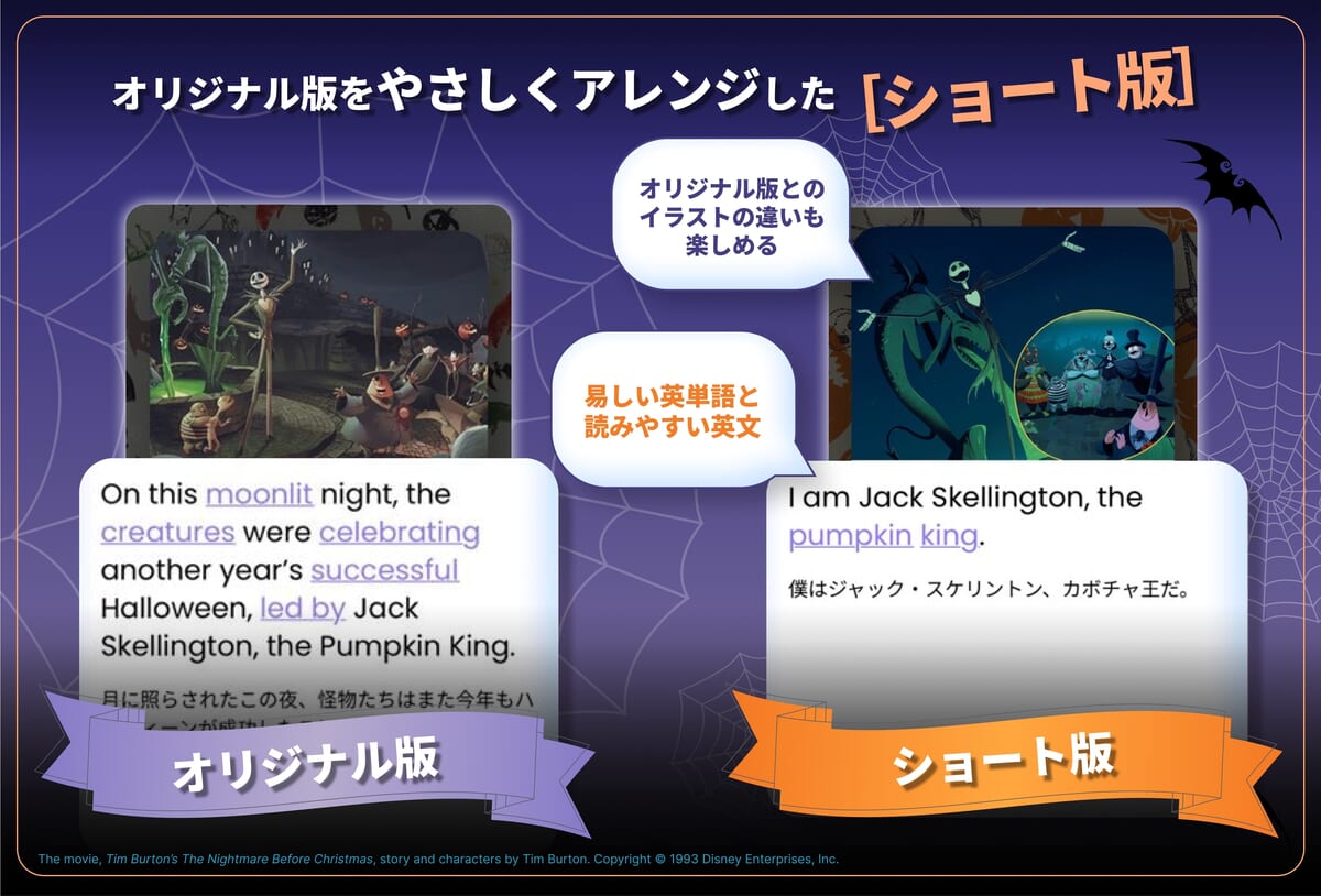 ディズニー作品やピクサーの作品で、「リスニング」から「スピーキング」までスモールステップで学ぶ「ストーリー」のコーナーに、ジャックの視点で語る『ティム・バートン ナイトメアー・ビフォア・クリスマス』の[ショート版]が追加されました。