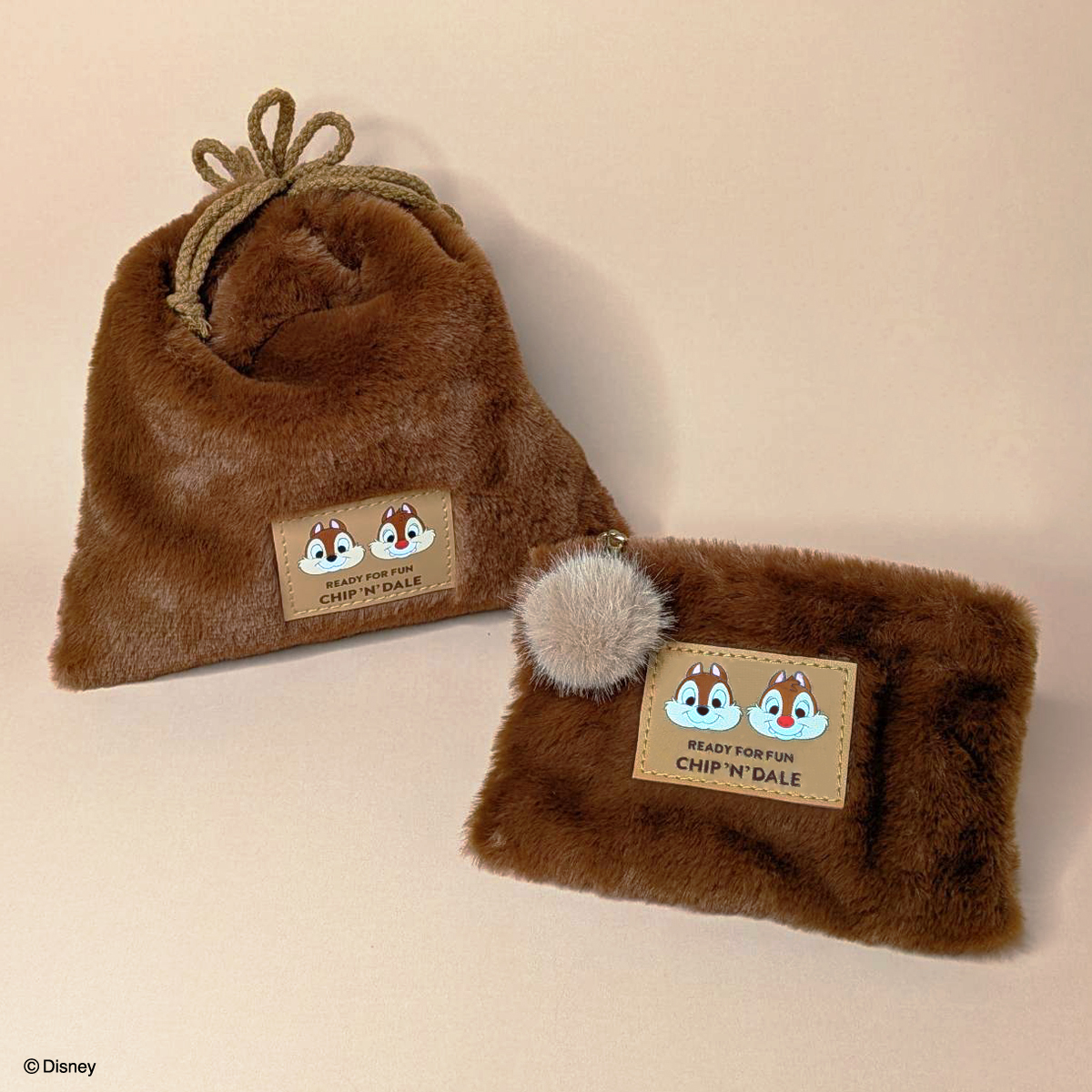 あちらこちらに散りばめられた仲良しな姿がかわいい「チップ」と「デール」の毛並みを思わせるふわふわのファー素材を使用した巾着ポーチやフラットポーチは、つい触っていたくなる質感です。
