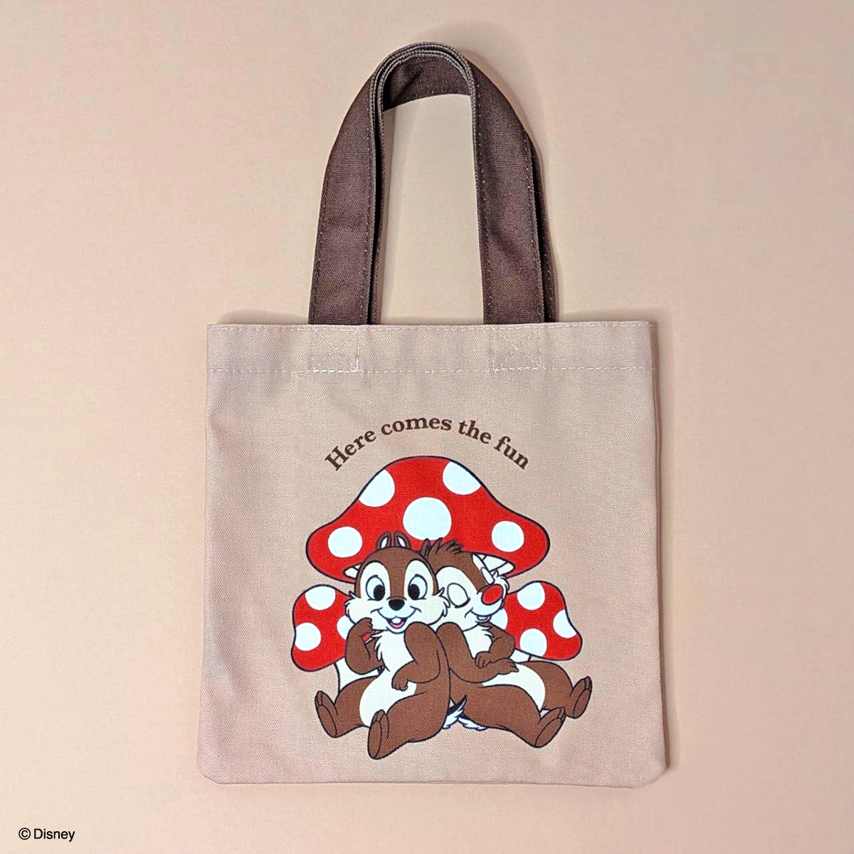 大きな赤いキノコを背景にした「チップ」と「デール」デザインのミニトート。