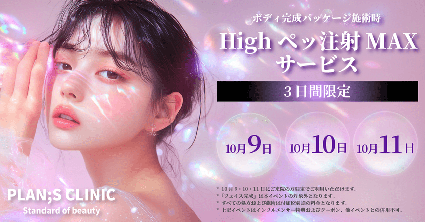 韓国美容クリニックPLAN;S CLINICは、2025年10月9日(木)から10月11日(土)までの3日間限定で、「ボディ完成パッケージ」施術を利用したお客様を対象に、「Highペッ注射MAX 1部位サービス」を提供するキャンペーンを実施します。