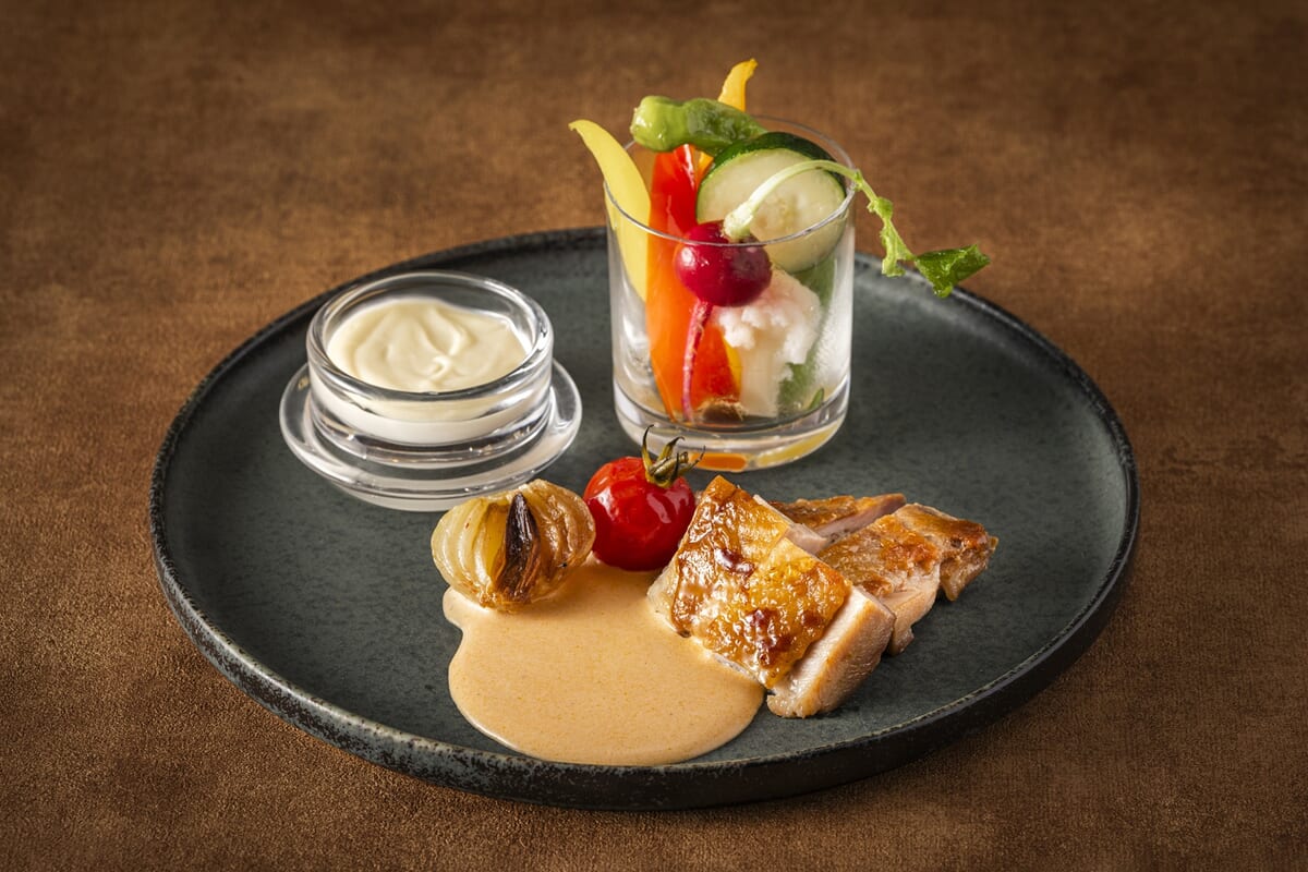 下段には、しっとり仕上げたチキンコンフィ トマトソースと、彩り豊かな季節の温野菜をバーニャカウダソースで提供。