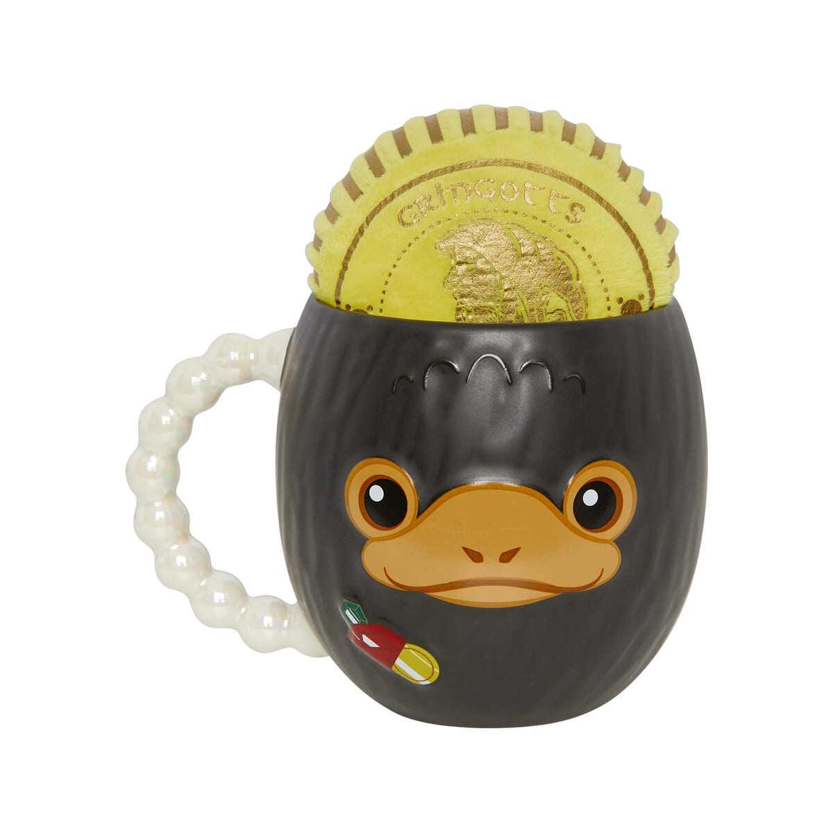 マグの中には、ガリオンコインを模したぬいぐるみがすっぽりと収まっている、ニフラーが集めた宝物たちが詰まった遊び心いっぱいのデザインです。