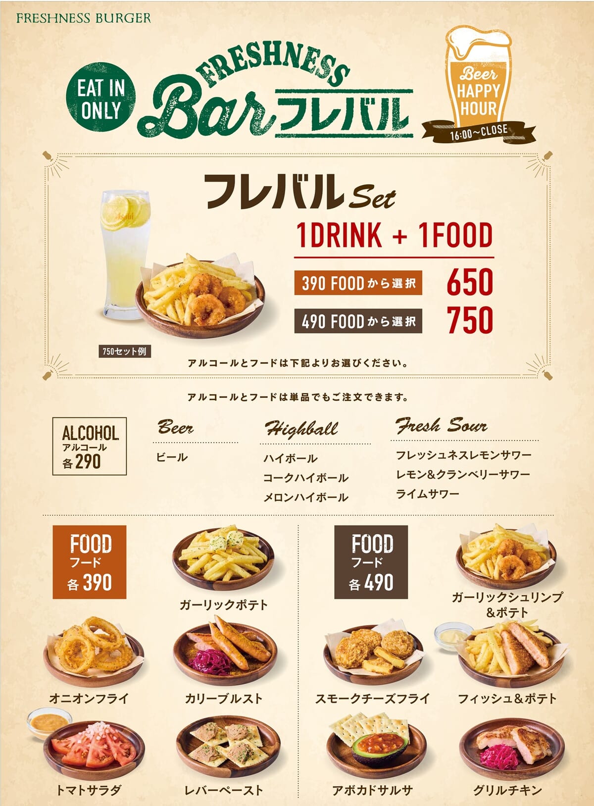 フレッシュネスバーガーが、16時以降にサクッと楽しめる、お酒とおつまみのセット「フレバルセット」の提供をスタート。