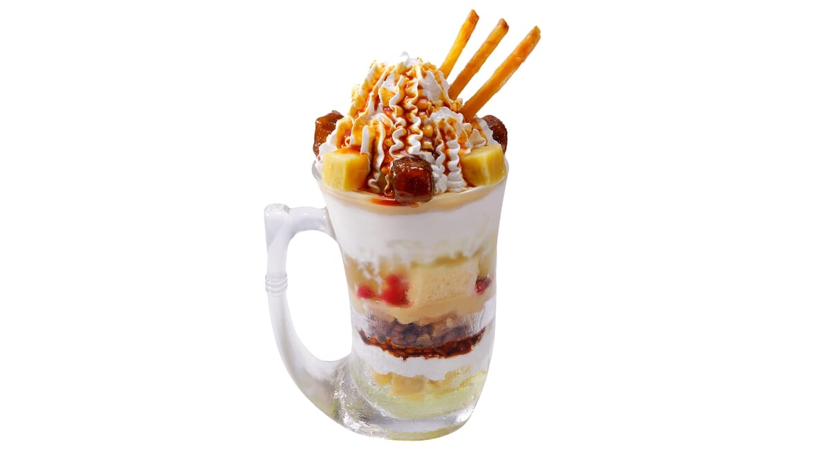「おいもパフェ」のトッピングに加え、バニラアイスやシフォンケーキなどを大きなジョッキに詰め合わせた満足感のある一品です。