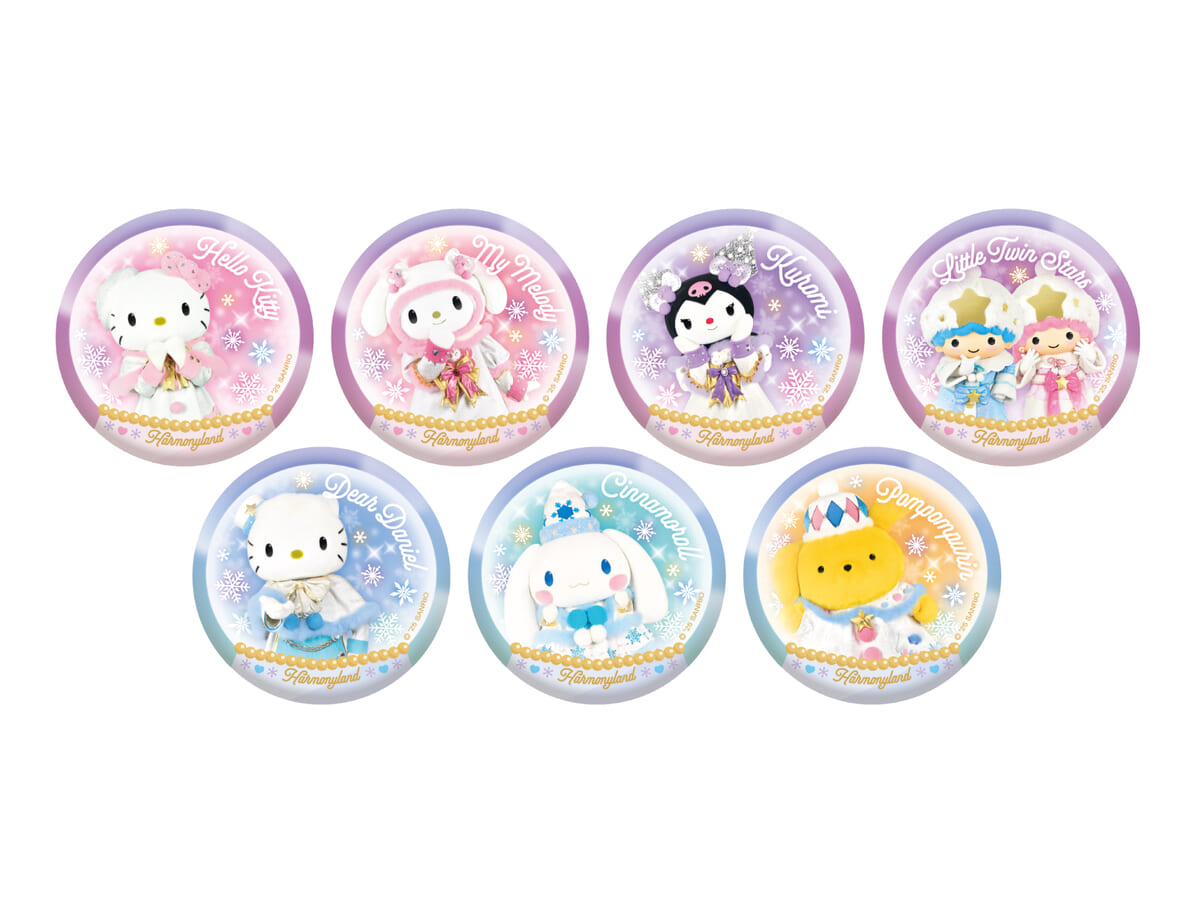 クリスマスのコスチュームを着たサンリオキャラクターたちをデザインした缶バッジ。
