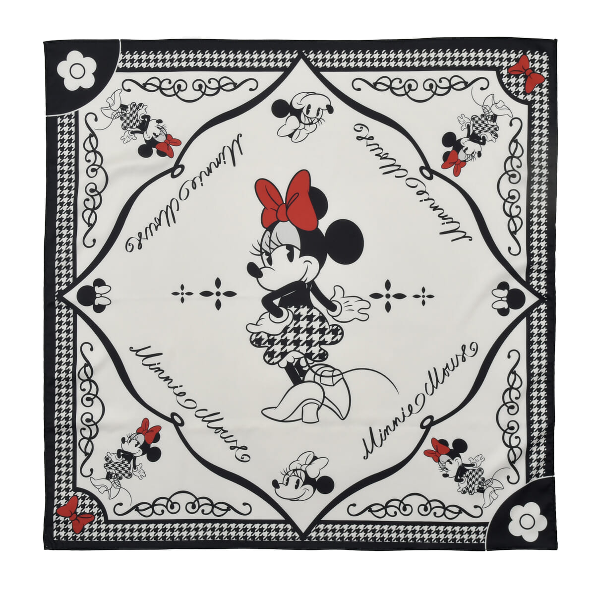 「ミニーマウス」のトレードマークであるリボンとブランドシンボルであるデイジーモチーフを四隅にデザインしたスカーフ。