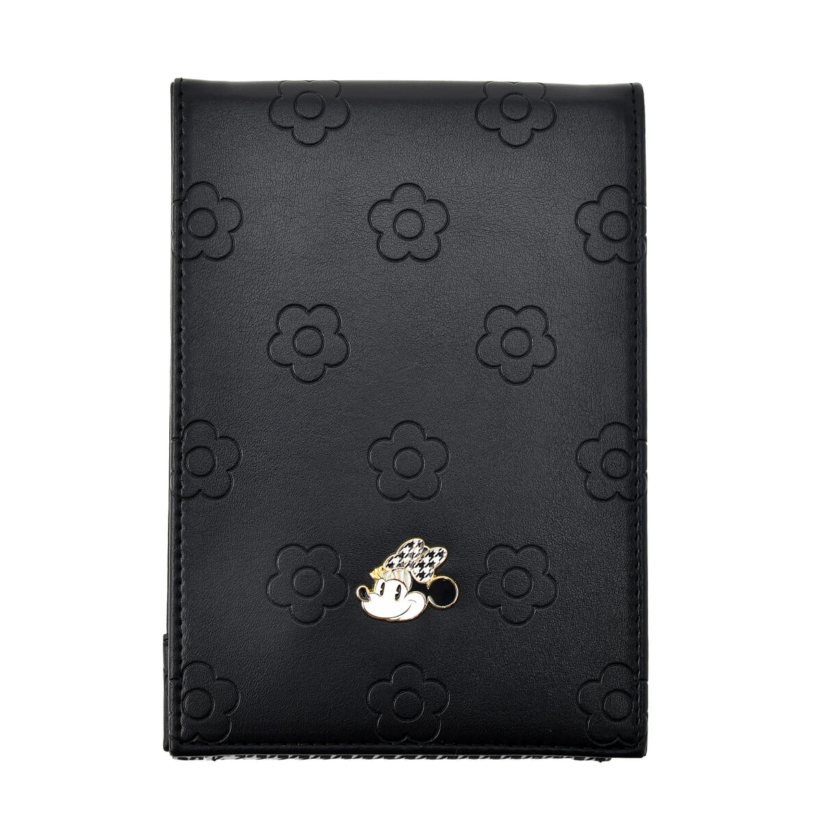 デイジーモチーフを型押しした総柄のカバーに、千鳥格子柄のリボンを着けた「ミニーマウス」をレイアウト。