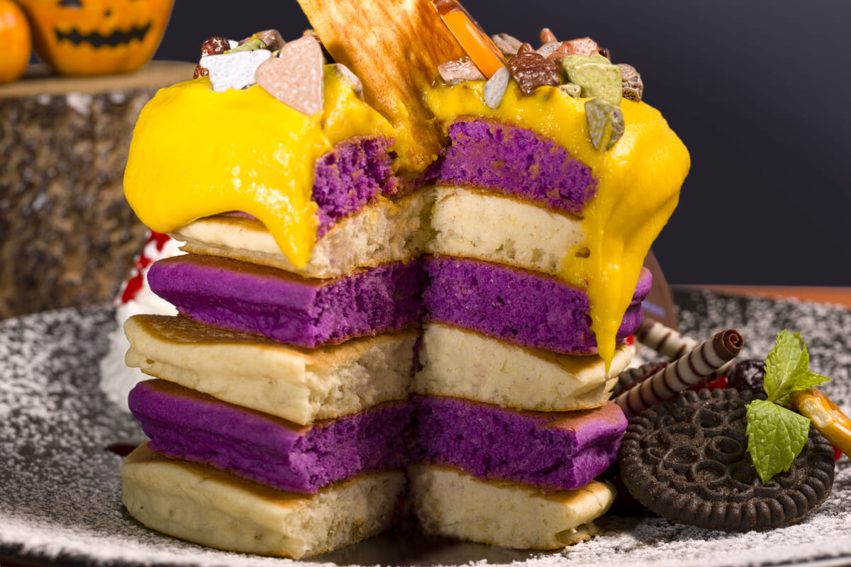ハロウィンナイトを照らす、紫芋とEggs ’n Thingsオリジナルのパンケーキを重ねた色鮮やかなハロウィン限定のパンケーキ。